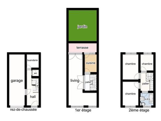 Le 2e étage comprend trois chambres de 10 m², 15 m² et 16 m² et une salle de bains équipée d'un lavabo, d'une baignoire et d'un WC.