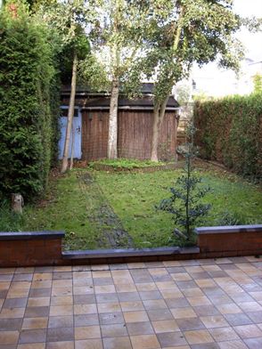 Au 1er étage, vous trouverez un jardin de 115 m² avec abri de jardin, une terrasse de 17 m², un living en L de 36 m² ainsi qu'une cuisine équipée (double évier, hotte, four, vitrocéramique).