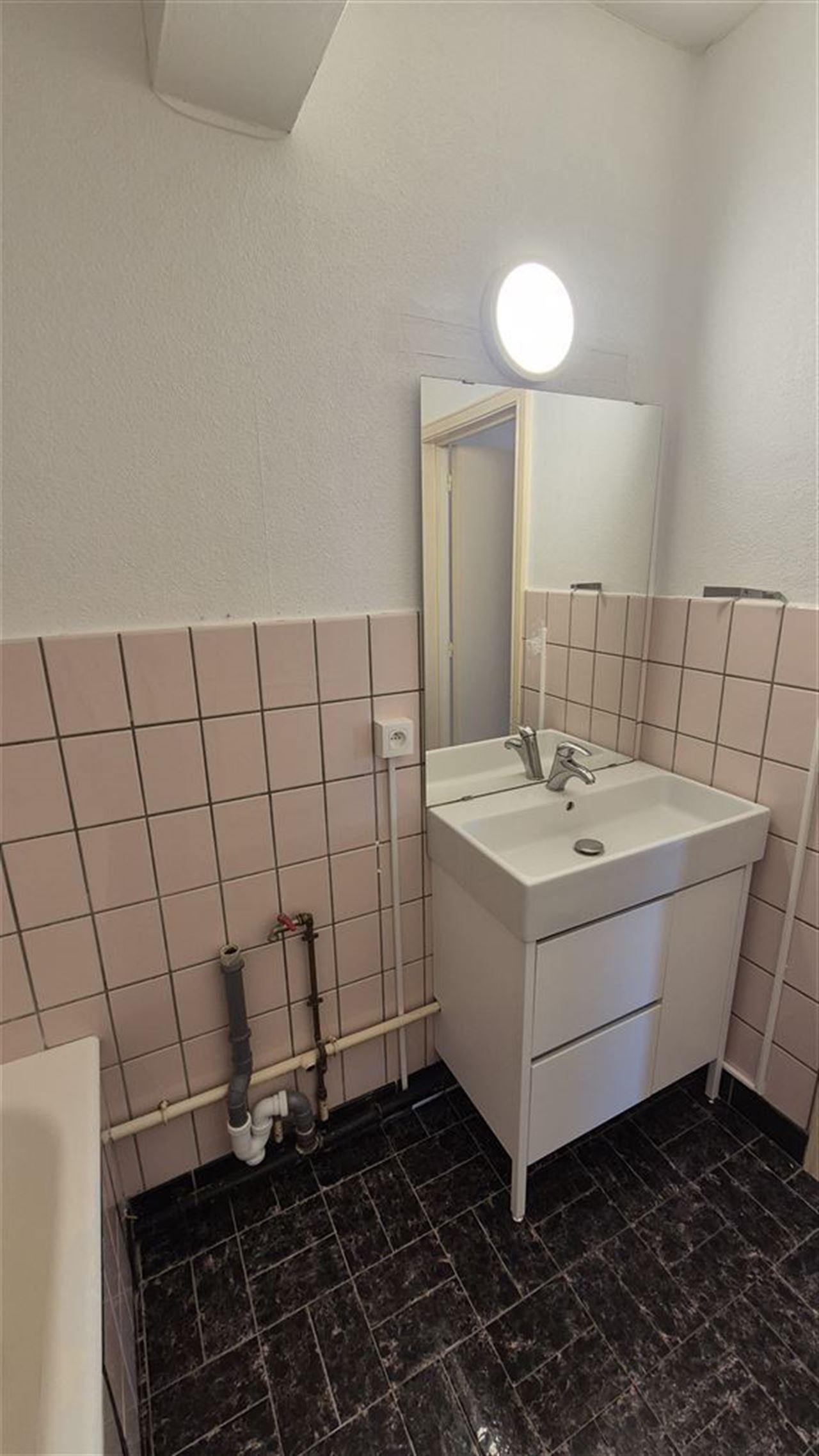 La salle de bain de 4 m² comprend une baignoire, un meuble évier ainsi qu'un emplacement pour machine à laver.